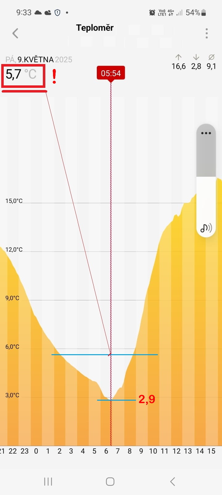 Na grafu je v době odečtu (5:54, červená svislá přímka) teplota asi 2,9st.