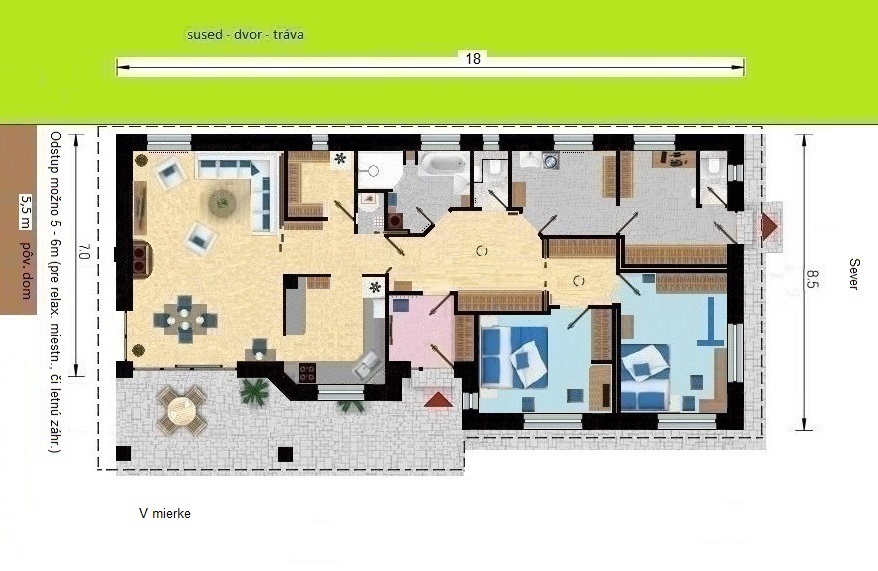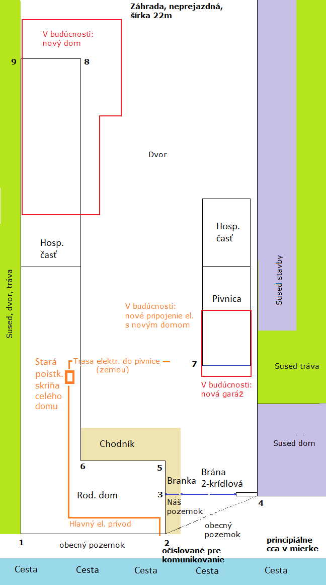 Malo by to mať dve etapy: teraz zabezpečenie starého domu (obr.), a potom po prípadnom postavení si domu vzadu (obr.) zabezpečenie dokončiť - vo výsledku by to malo byť kompatibilné, alebo nejako zlučiteľné na jeden celok, a pod., proste potom všetko pod mojim patronátom vzadu.