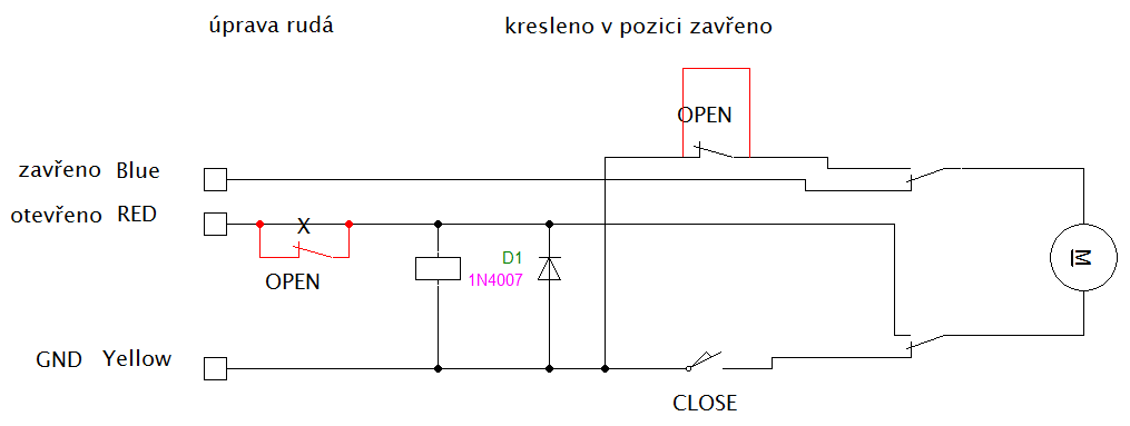 jen pro zajímavost přikládám úpravu elektroniky ventilu. Uvnitř ventilu je reverzovací relé a dorazové kontakty. Při otevření zůstávalo sepnuté relé, které má nějaký odběr ( používám ventil ve spojení s baterií , s bistabilním relé a plovákem pro napouštění nádrže) a vybíjel mi baterii. Provedl jsem jednoduchou úpravu dle obrázku, třeba někomu přijde vhod.