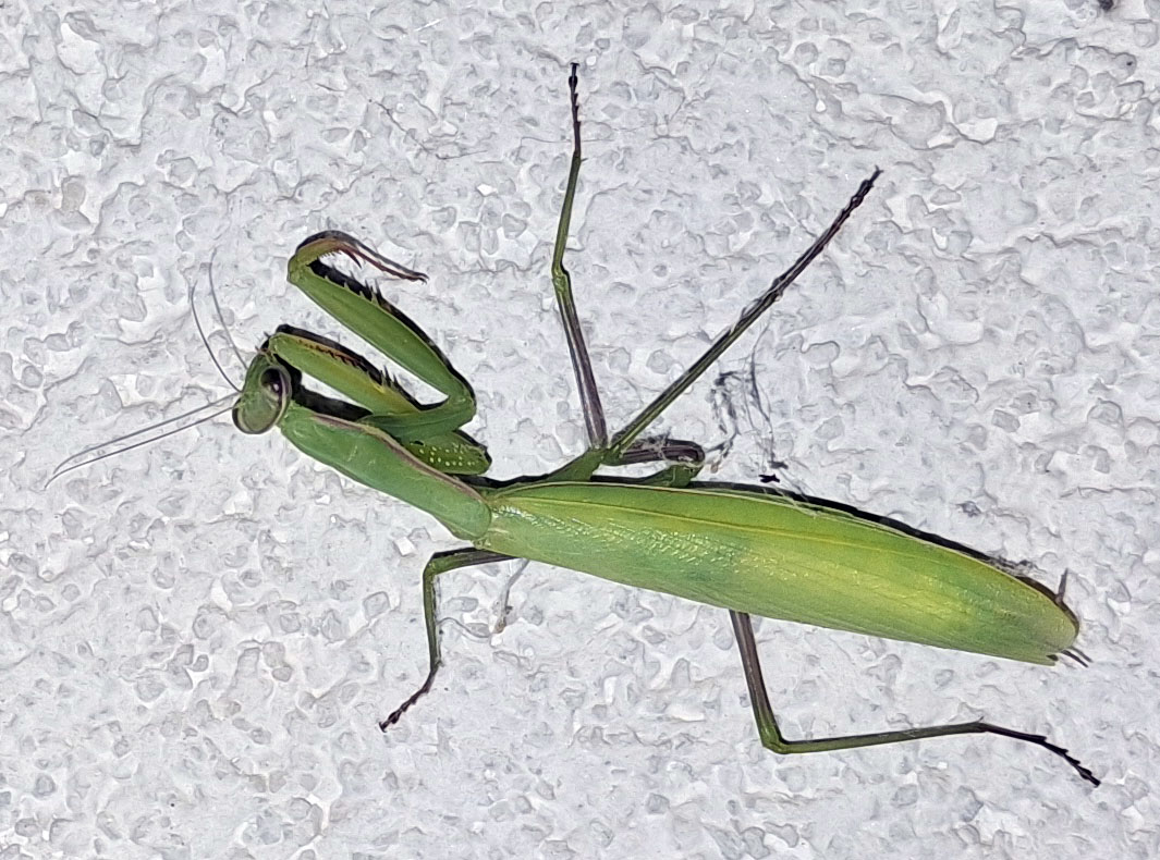 Byl jsem pustit trochu vody na trávník a na polštáři seděla docela velká kudlanka. Jsou tu vidět čímdál víc, na jaře malinký, tak 10 mm velký a teď už i velký.