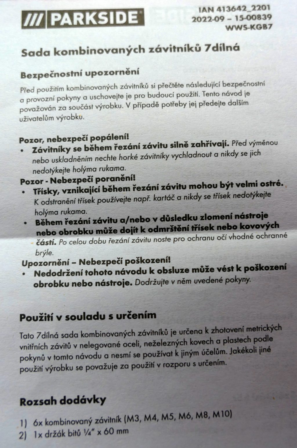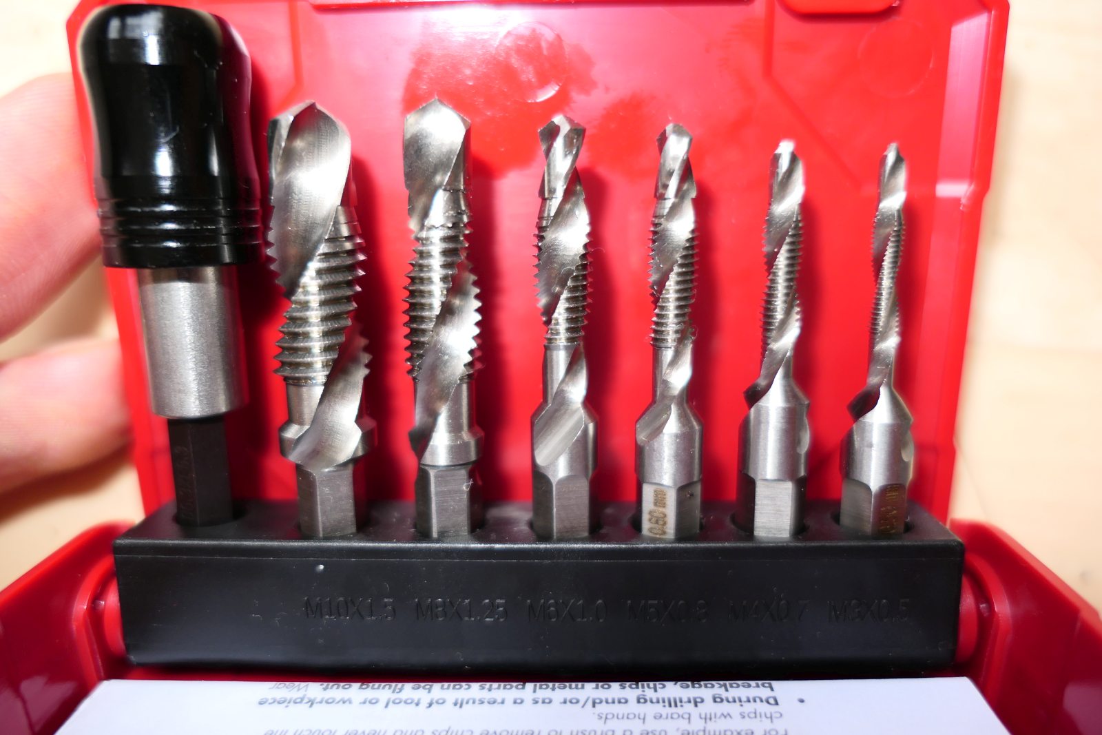 Návod se nedá stáhnout, tak jsem vám ho nafotil... Jak dobré se vám zdají?? Výrobce neuvádí, jestli je matariálem HSS nebo aspoň nástrojová ocel... Návod je trochu srandovní. No do hliníku to snad bude stačit. Ale nepoužívejte to nikde, kde by vadilo zalomení závitníku v díře... Naštěstí v domácnosti je i klasická sada Narex M1-II vyrobená z Poldi HSS. (Zdravíme Vladimíra Stehlíka.)