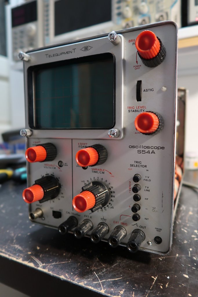 Firmu Telequipment koupil Tektronix, aby si ukousl taky kousek z trhu low cost osciloskopů. Proto, když se mi naskytla příležitost, tak jsem si jeden koupi. Byl velmi zbědovaný a chvíli si pobyl v koutě. Pak se na ebay objevil jeden vrak, který byl na tom lépe a naskytla se příležitost z nich udělat jeden solidní kousek. Nějakou dobu to zabralo, ale konečně je to hotové. Je to pěkný, velmi jednoduchý ale dost šikovný osciloskop. Na konstrukci je vidět, že do ní zasahovali inženýři z teku a výsledek je jednoduchý, ale překvapivě kvalitní a variabilní přístroj. Je to jednokanál do 10MHz, obrazovka krásně kreslí, synchronizace je uspokojivá a protože byl určen hlavně pro servisáky televizní techniky, je udělaná i synchronizace pro TV obrazový signál.