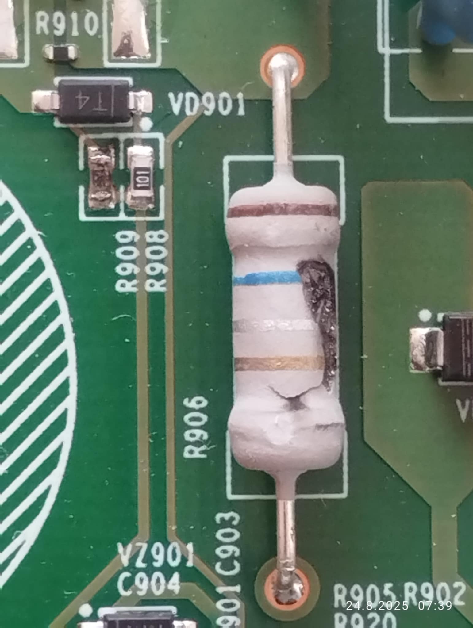 Spálený odpor R909 lze nahradit hodnotou ze schematu.