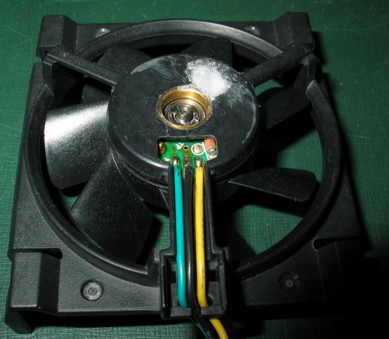 Rozobral som teda ventilator, aj tak je zrely na vymenu lozisiek. Je to SANYO DENKI 109X7612T5S03 - box chladic od P3 Tualatin. Vidiet tam spaleny odpor od jedneho vyvodu IO. Ventilator pritom normalne funguje, pri 12V zerie 0,14A (na stitku je 0,17A).
