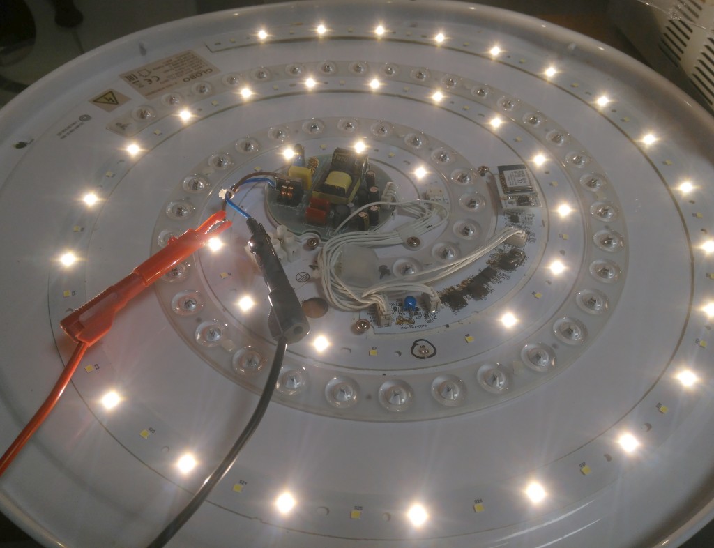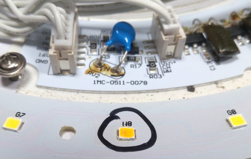 Tak jeste zpet k tomu LED svetlu. Vytahal sem 14 plastovych trnu (coz jde docela blbe), ktere drzi optiku nad LED paskem a hned jsem identifikoval 1 vybombenou LED, takze premosteno a uz to sviti