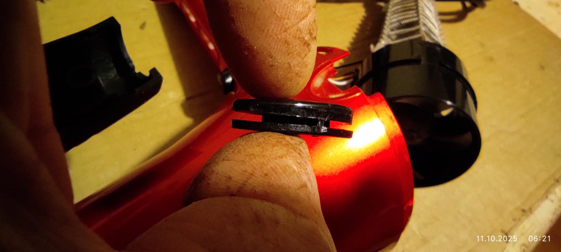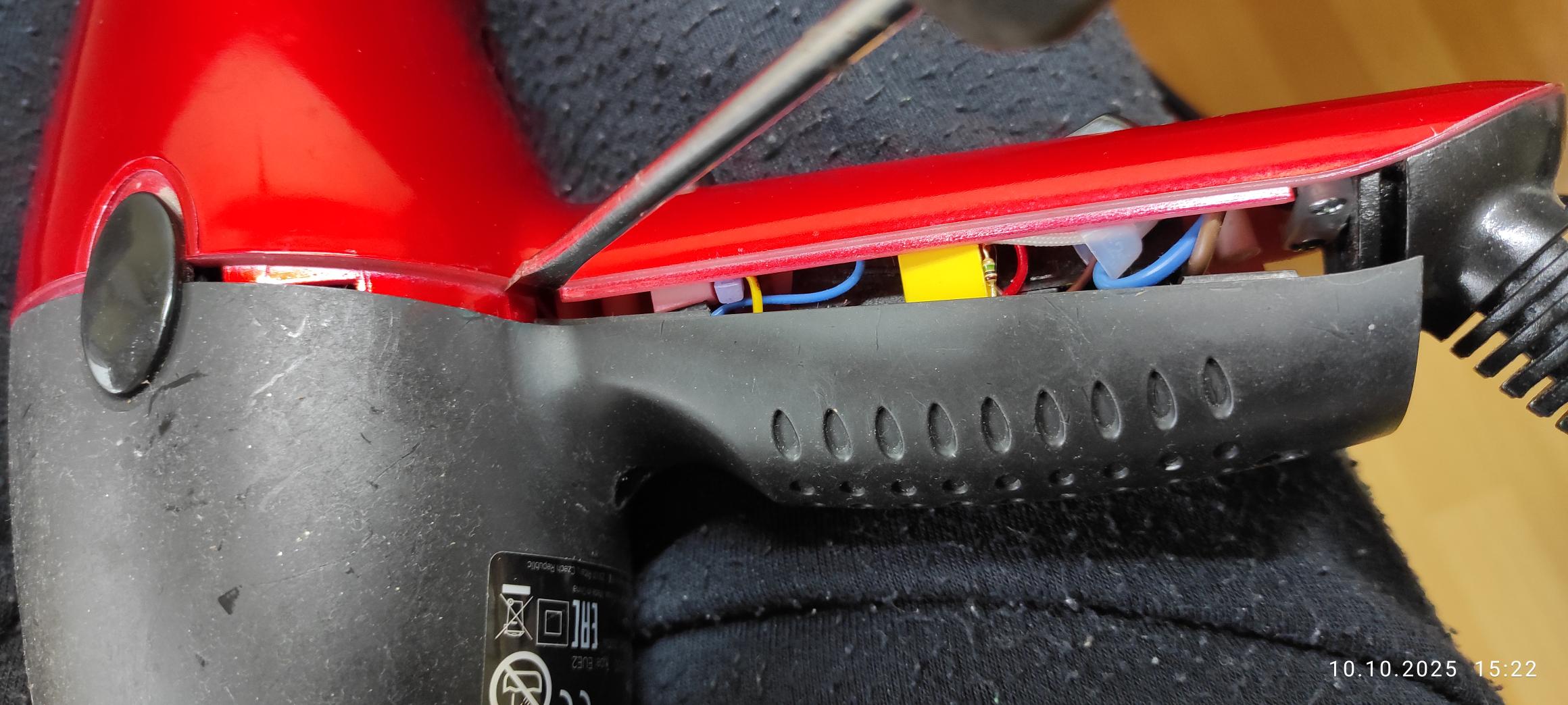 Na rukojeti jsou dva šroubky které jsem odšrouboval, zadní děrovaný kryt se pootočí a sundá ale celý ten černý kryt ještě nějak drží na tom červeném tělese. Jsou tam ještě nějaké gumové oválné jakoby zátky ale nějak silně tam drží a bojím se je násilím vyndat (jak nebude jiná možnost tak to budu muset tu sílu použít).