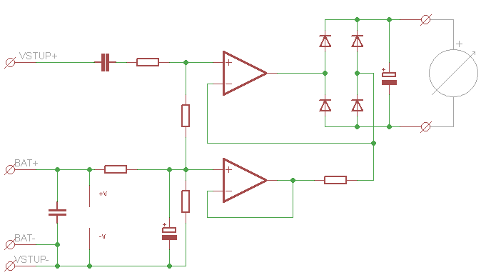 Ale dobrá - řekněme, že pro Avomet si to postavíš celé, pak má Ekkar pravdu: při použití měřidla s lineárním usměrňovačem (což je v tom schémátku vše od uzlů 3/3' vpravo): běžná křemíková dioda typu 1N414x je nejméně vhodná, protože má velký úbytek napětí v propustném směru. Ten musí zesilovač během průchodu signálu nulou "přetlačit", což zvyšuje nároky na jeho zisk a rychlost přeběhu, aby zůstala zachovaná linearita stupnice od počátku, a aktivní část usměrňovače nezakmitávala, protože v oblasti průchodu měřeného signálu nulou pracuje ten zesilovač s prakticky otevřenou smyčkou zpětné vazby, tedy i s maximálním ziskem.