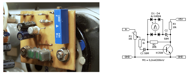 Ale no tak: zrovna se bavíme o tom, jak oddělit vstup zvukovky od měřeného obvodu, aby nebylo třeba stavět ještě ten aktivní usměrňovač k měřidlu.