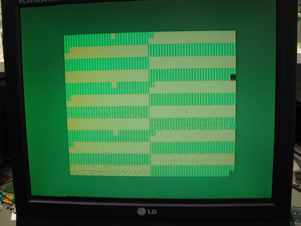 Obvod PLA možná funguje (dokonce naskočí "nenulový" border). Obsah šachovnice se mírně liší s každým zapnutím napájení (a následným čekáním řadu minut po jeho odpojení). Náhradní Z80 osadím po opravě několika spojů. Pro urychlení testu jsem dvanáctivoltovou větev napájel lab. zdrojem (obešel jsem nefunkční stabilizátor s KZ260/13 a KC635).