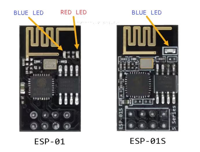 Modul EP01 má dve LED, červenú pripojenu na POWER a modrú pripojenú na U0TXD (pin 26 ESP čipu). Modul ESP01S má len jednu modrú LED pripojenú na GPIO2 (pin 14 ESP čipu).