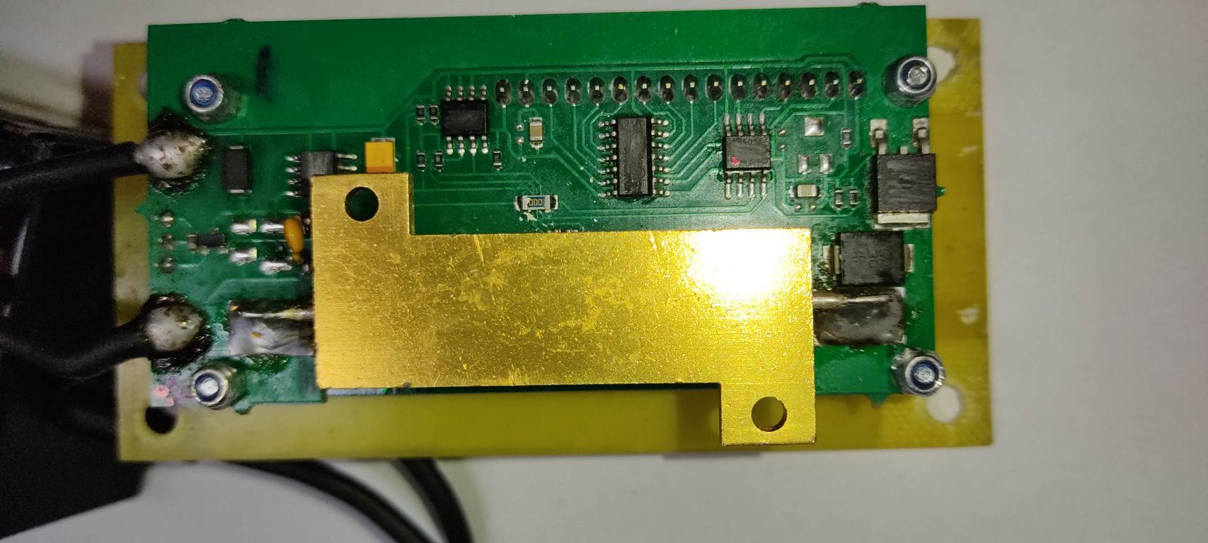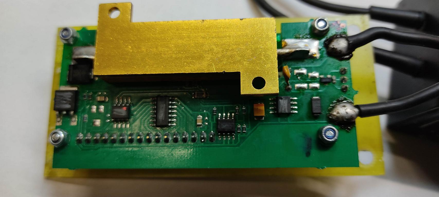 Dostala se ke mě na stůl tato krabička pro měření kapacity baterií a nemohu přijít na princip. IO jsou přebroušené a zapojení je na + výkonový 1Ω rezistor v sérii s diodou spínaný přes mosfet na GND. Na + a GND je ještě připojen 5V stabilizátor pro napájení elektroniky. Poblíž výkonového rezistoru je termitor. Ale není žádný spoj od celé výkonové cesty k obvodům . .