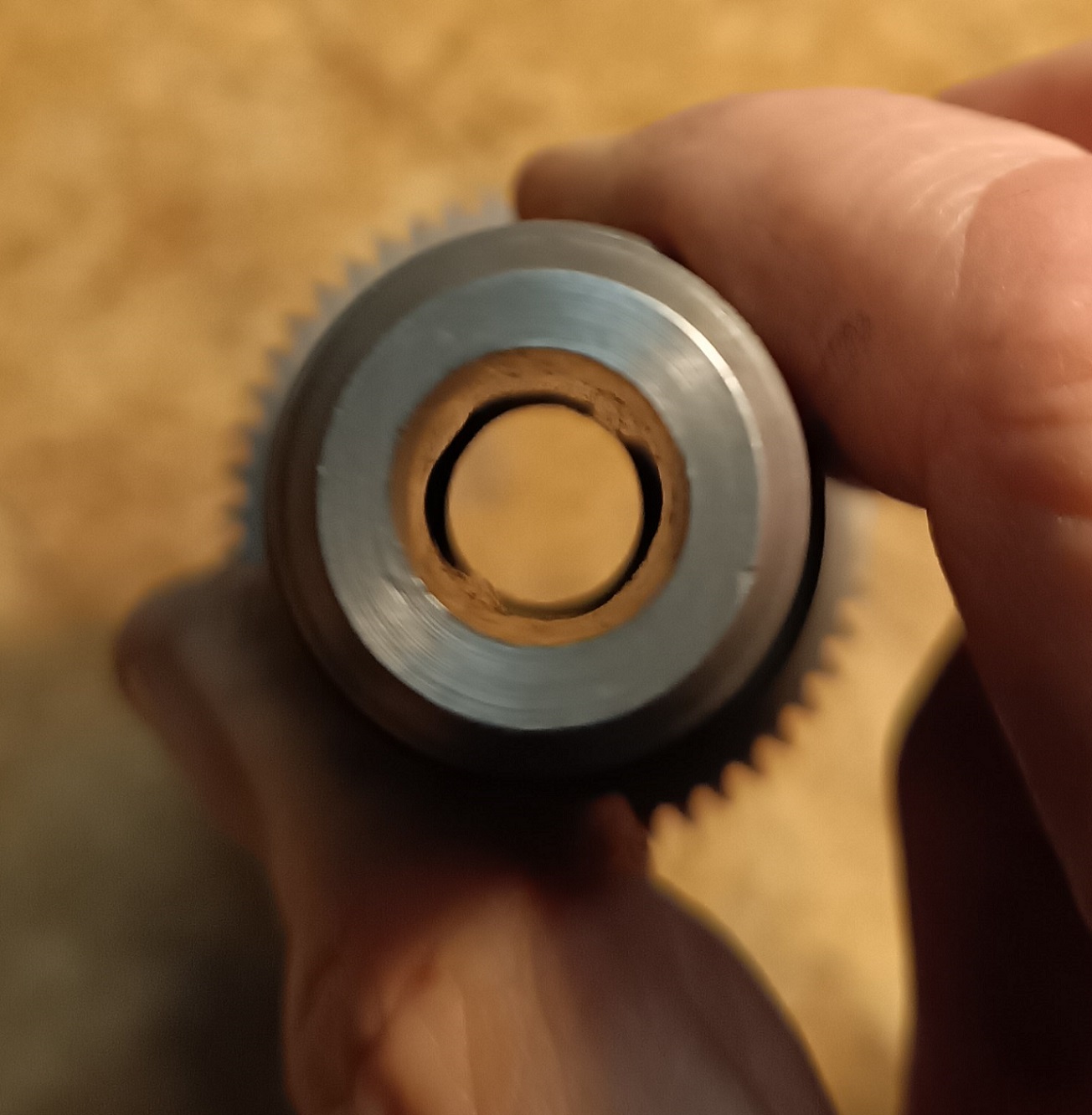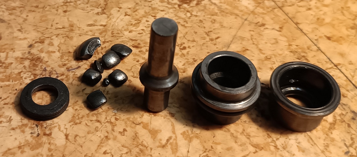 Druhá závada byla v sestavě pístku, co přenáší rázy z pneumatickýho pístu na vrták / sekáč. Vysypalo se mi z sestavy pár kousků železa řádně omletých dlouhým používáním. Když jsem ty kousky poskládal, tak to vypadá na nějaký vymezovací kroužek.