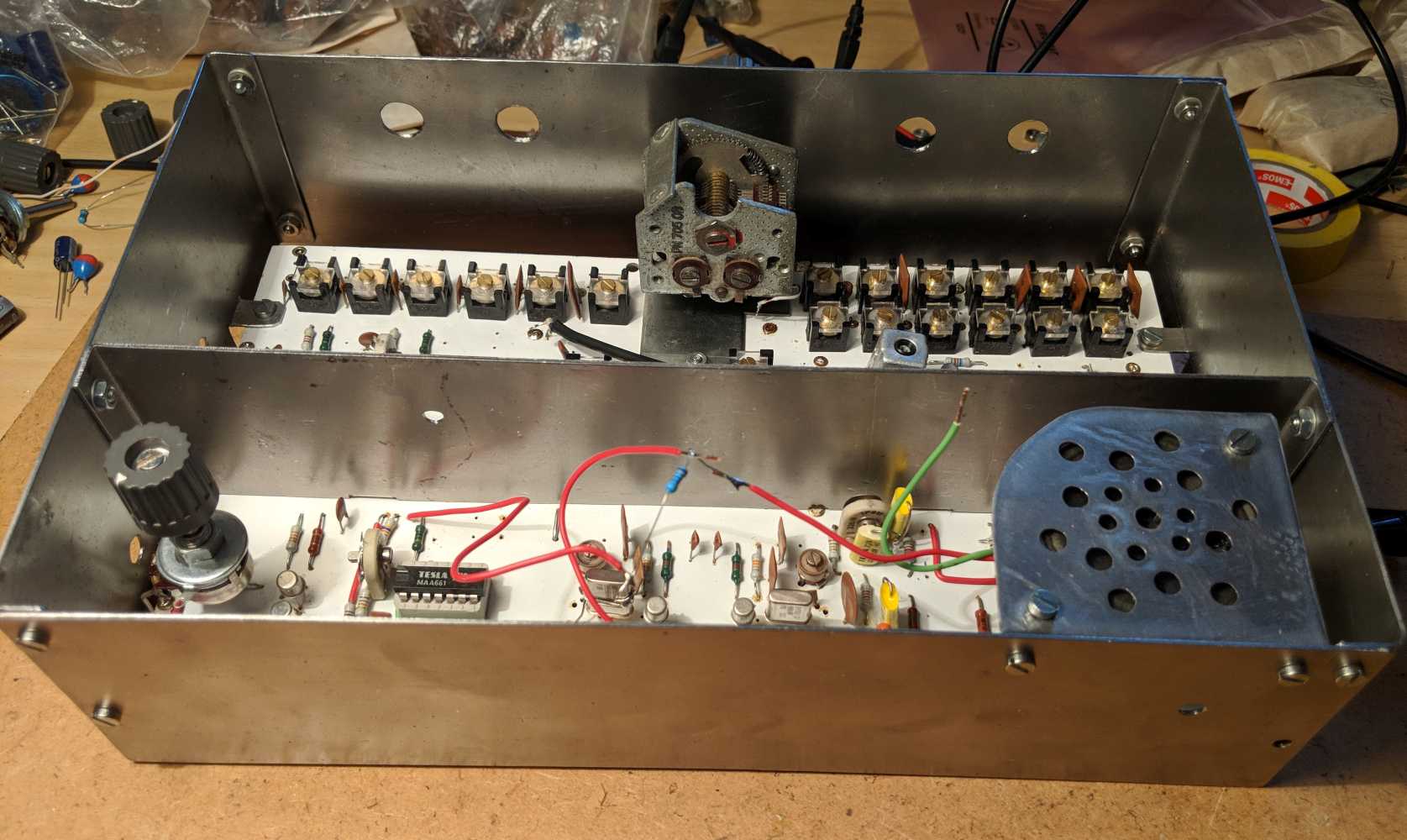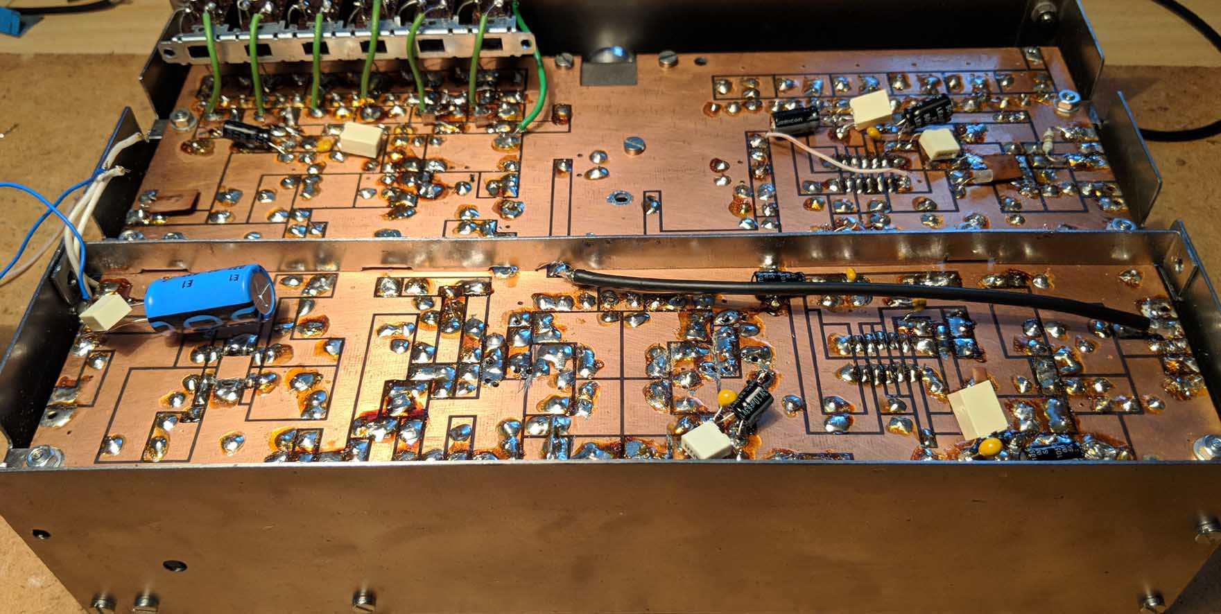 Všetky bloky sú preblokované elektrolytom, fóliovým (stovky nF) a keramikou (desiatky nF) - tak trošku náhodnými hodnotami podľa toho, čo bolo poruke. Filtre medzi blokmi som nestihol, bude to ďaľší krok. Na tú stredovú prepážku sa dajú primontovať malé krabičky z pocínovaného 0,5 mm plechu. Ale začína tam byť trochu tesno.