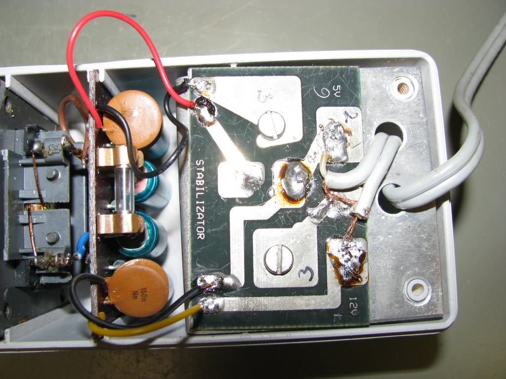 [1] 78L12, 47µF/50V (v nestabilizované části napájení 12V), osvědčený odpor 68Ω; zatím nečištěno a nepřepájeno pro krasopohled. Za původním obvodem stabilizace byl ještě elektrolyt 10µF (prapůvodně tantal 6M8), na dolní straně to nevyhlíželo moc pěkně, příště dojde ještě k jednomu zákroku.