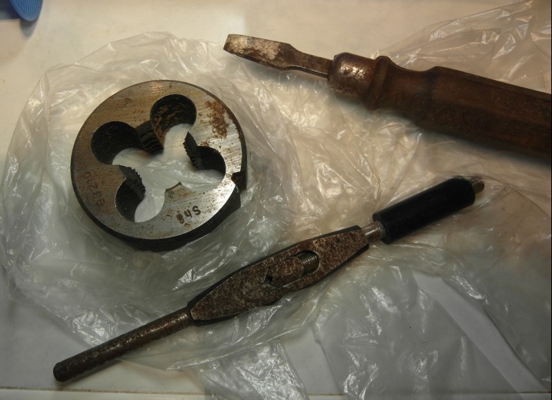 Kôpka drobností pri našom kontajneri, okrem troch kosákov a pod. aj veci na obr. Tomu vratidlu som a potešil najviac, tak veľké oko je u mňa nepoužiteľné, šraubovákov mám kopu, no ale nezober to.. Ako to slušne odhrdziť? Dobre mienená rada v minulosti pri čomsi inom natrieť sadlom a zamotať do handry vtedy nepomohla.