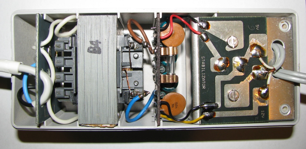 Při 232~ (v době měření) je na nezatížené 12V větvi asi 27,2V. Před odporem na DINové zásuvce asi 20,3V a před 78L12 asi 15,4V. Na konci 12,03V (měřeno proti plechu modulátoru), na výstupu MA7805 bylo 5,06V a na 11/Z80 5,01V.