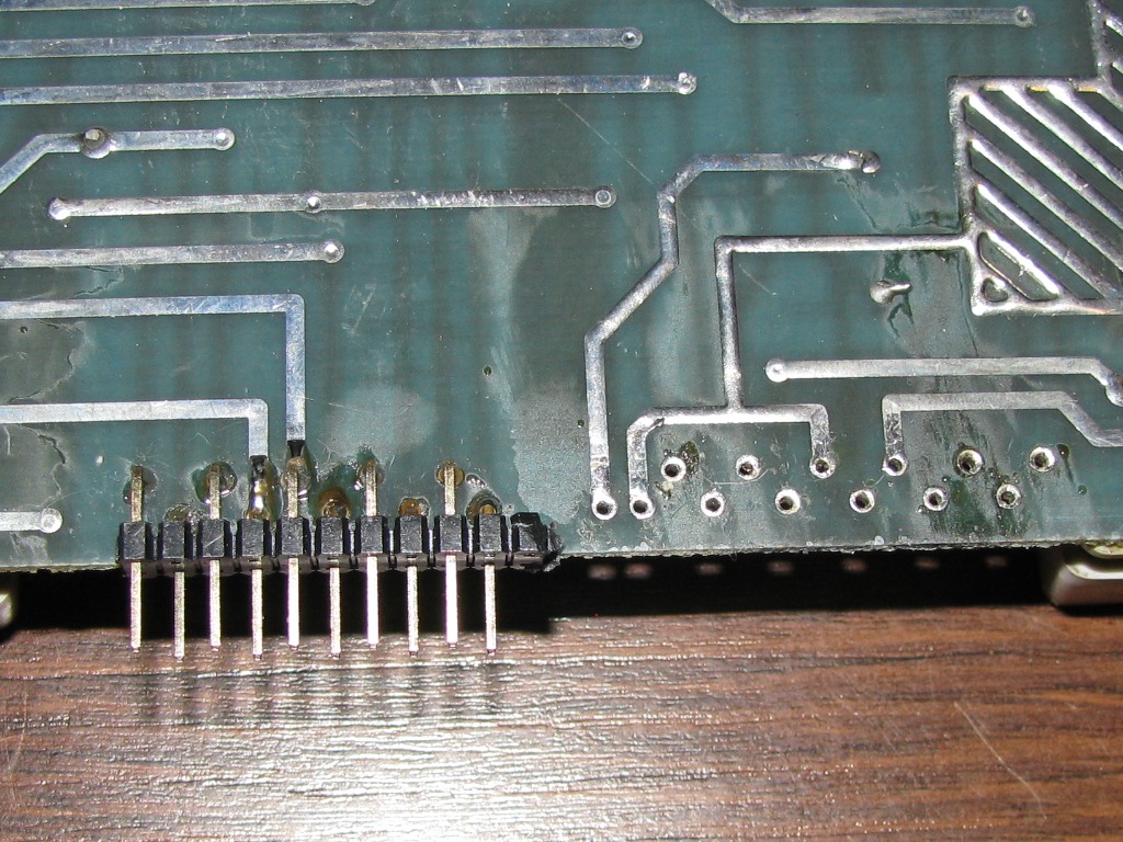 [3] Strana klávesnice, první nástřel z nalezených zbytků, překážející kolíky jsem štípal a tahal ven (je-li k mání nový, tak ideálně snad vhodně naporcovaný 90° S2G50W). V pátek odpoledne před svátkem mě ovšem z firmy záhy vyhnali, takže to není celé, dokrájené a očištěné. Pájet přímo na konce kolíků by sice šlo, ale lepší bude kšanda s vhodnými konečníky na obou stranách.