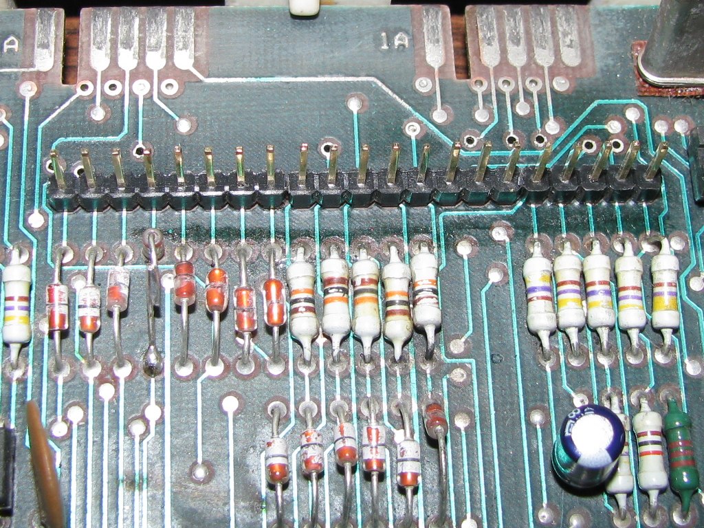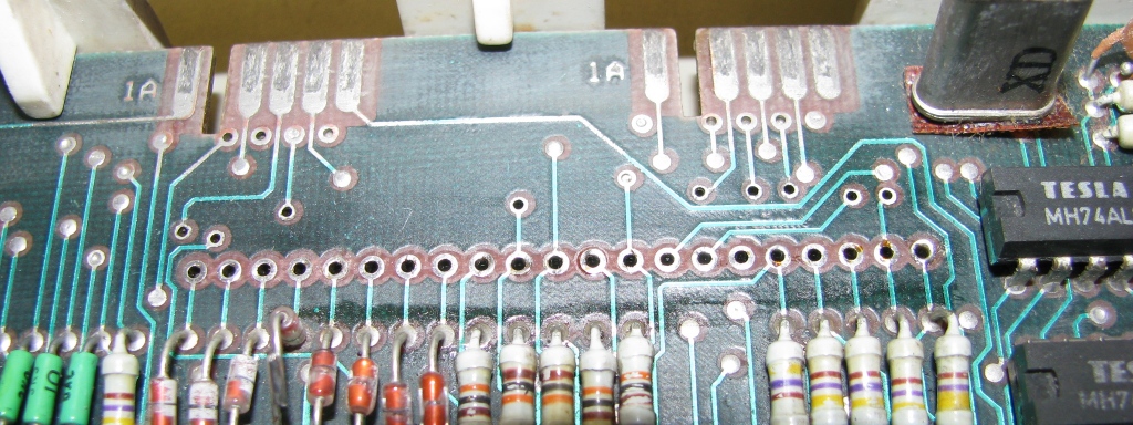 Povšimněte si jedné z prvních zakladatelových fotek. Zakroužkované místo po vystřeleném tantalu mě teď nezajímá (osadil jsem tradiční Panasonic 47µF/50V). Zřejmě už ve výrobě udělali podivný "tuning" (součinnost PLA a CPU asi mnohdy nebyla úplně bez chyb), anžto na vývodu PLA č. 40 (RAS non) je C 47p proti GND. RAS je z hlediska PLA výstupní a vede jen na obě paměti (jak jinak). Jenže! V dolní části foto je ještě jeden C 47p a původně (?) sídlil mezi RD non a GND. RD je z hlediska PLA vstupní. Jenže on byl jedním vývodem (mířícím na GND) víceméně v luftě. Připájel jsem C stejným způsobem, jako je tomu u prvního 47p a zmizely chyby zmíněné dřív: