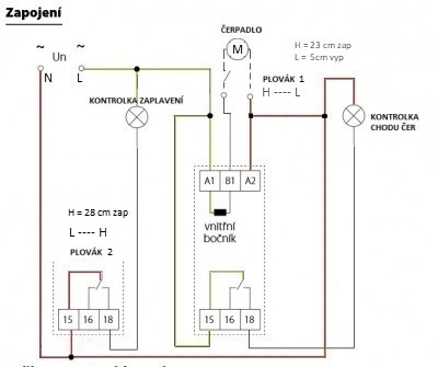 Super ďakujem, len princíp som upravil pre tie moje požiadavky: čiže pri priesaku ak čerpadlo stíha tak zopne kontrolka chodu čerpadla, ak je toho viac tak zopne plavák č.2 ďalšiu kontrolku-bzučiak, ešte skôr než voda vystúpi zo šachty. Zbytok rieši podľa situácie obsluha. Predpokladám že pripojenie L a N je ľubovoľné, pripojil by som dľa obr.