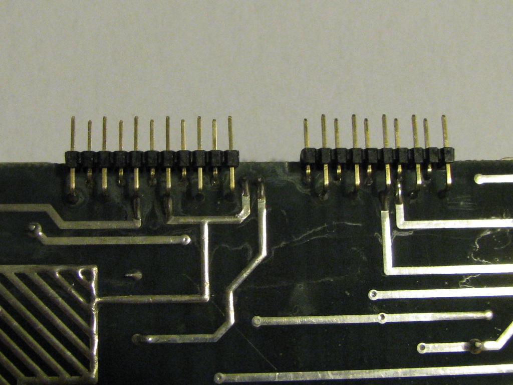 [3] Strana klávesnice, první nástřel z nalezených zbytků, překážející kolíky jsem štípal a tahal ven (je-li k mání nový, tak ideálně snad vhodně naporcovaný 90° S2G50W). V pátek odpoledne před svátkem mě ovšem z firmy záhy vyhnali, takže to není celé, dokrájené a očištěné. Pájet přímo na konce kolíků by sice šlo, ale lepší bude kšanda s vhodnými konečníky na obou stranách.