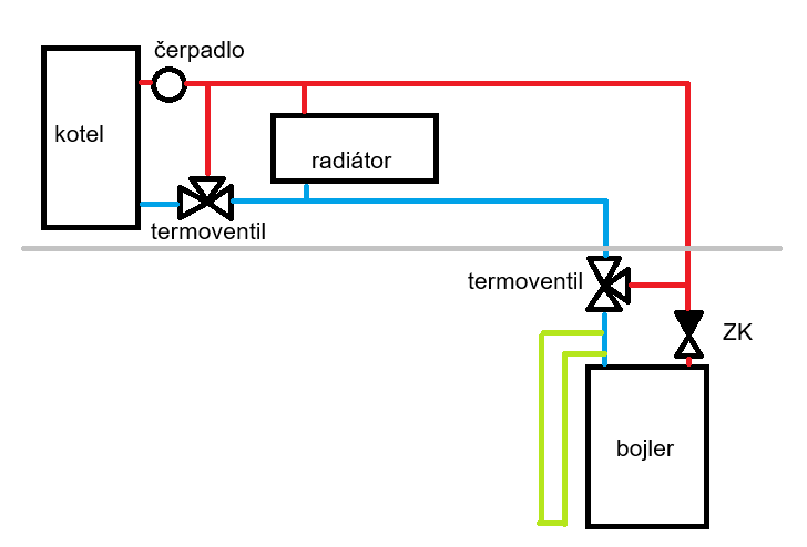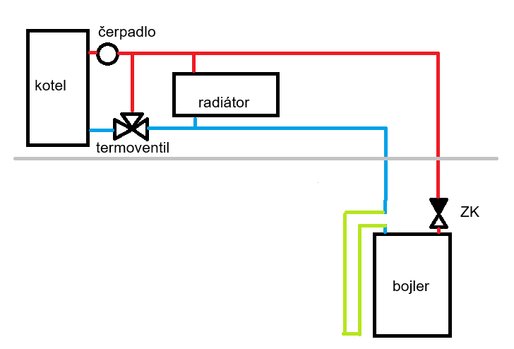 Potřebuju připojit kombinovaný bojler s topným hadem na okruh topení s plynovým kotlem. Chtěl bych se obejít bez elektrických prvků. Na obrázku je standardní zapojení, jak se taková věc provádí, nicméně mám následující problémy: