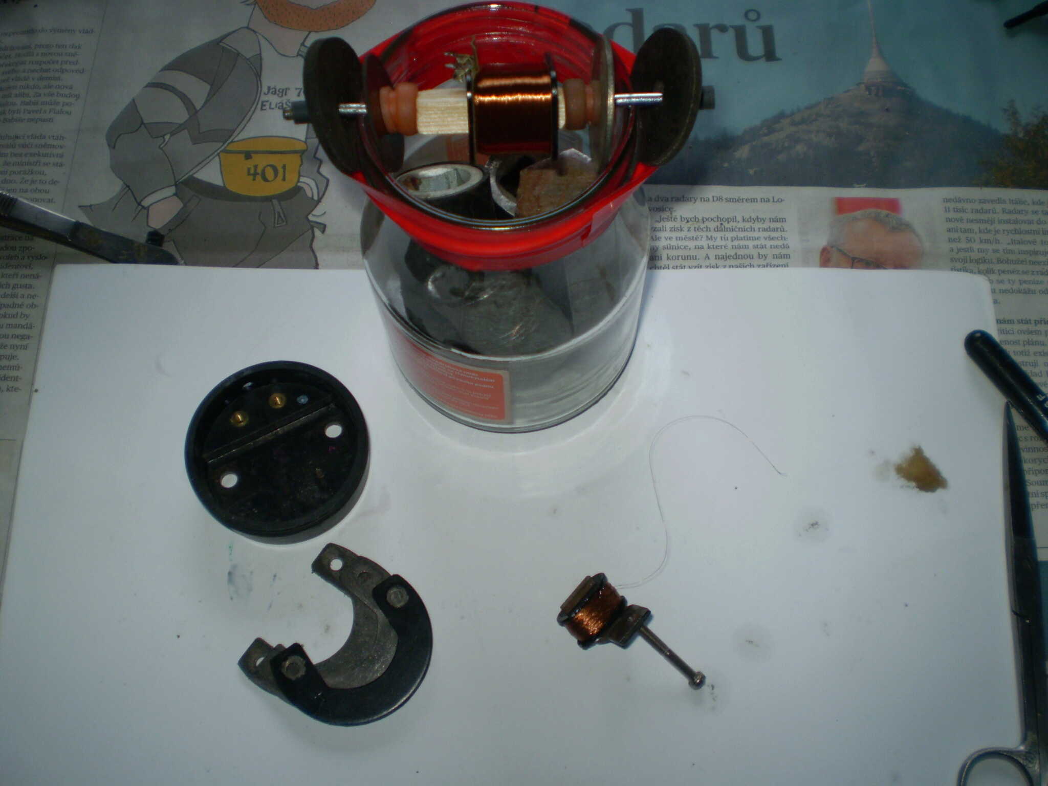 Cívka navinuta viz obrázek i s inovativním odvíječem drátu. Nepřevíjel jsem celou , pod cca 850 závity bylo přerušení , bylo to tam divně namotané ve vysokém úzkém svazku a nějak se to sesmeklo a asi pnutím přerušilo . Původní cívka měla 1000Ω, po odvinutí zbylo asi 690 Ω. Stř. délka závitu byla asi 4,2 cm, odpor původního drátu jsem naměřil 9.1Ω/m , což odpovídá asi drátu 0.05mm . Takže ubylo asi těch 850 závitů . Jako dárce drátu posloužil vrak relé RP90A s cívkou na 220V namotanou drátem 0.063 mm