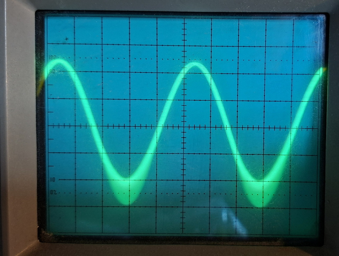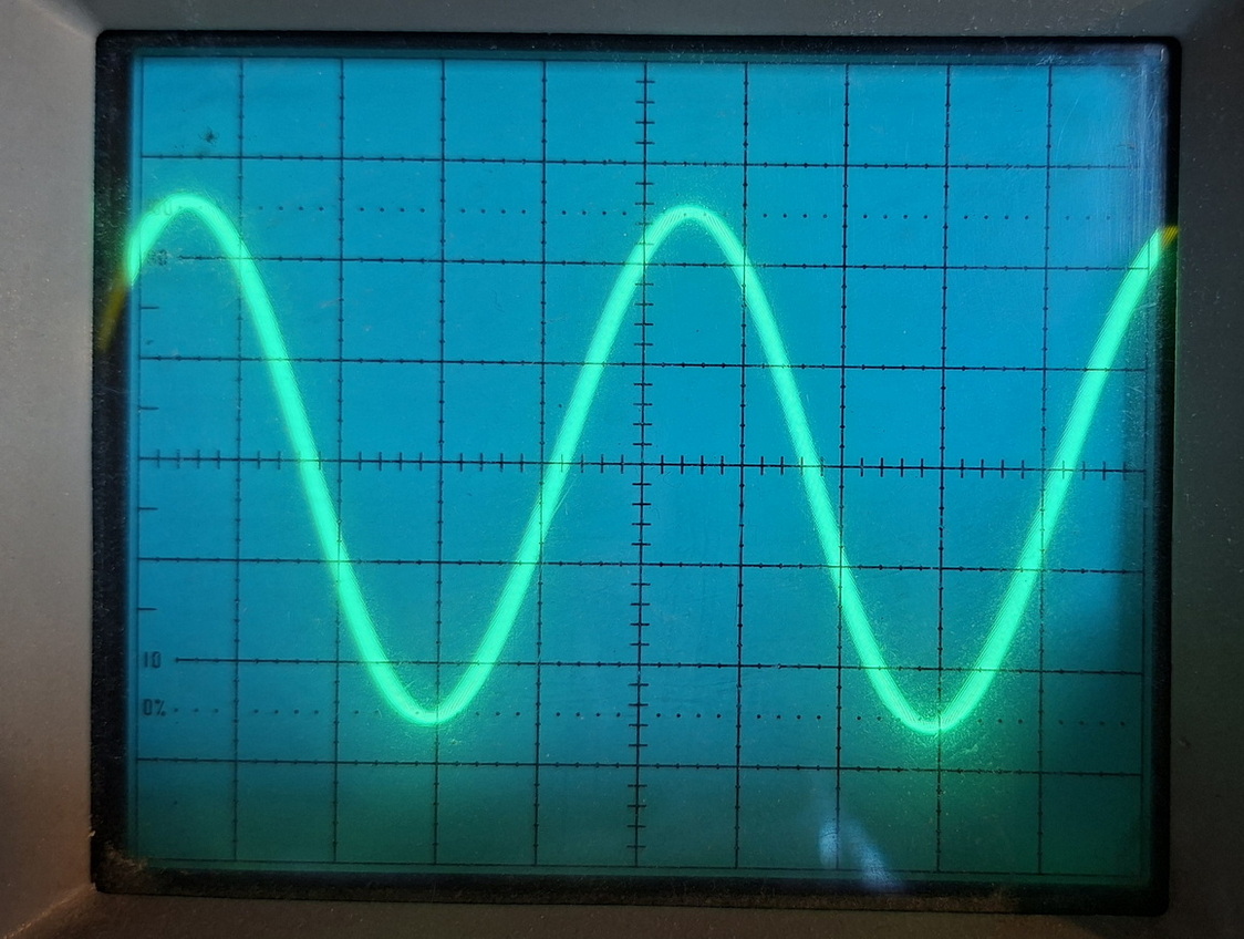 Může na té sinusovce být superponované vf kmitání. To by bylo vidět lépe na paměťovém škopku, nicméně mělo by stačit přepnout časovou základnu asi tak na desetinu nastaveného času nebo i míň.