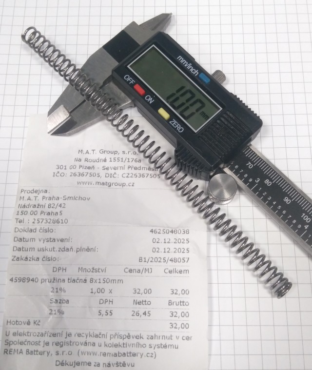 Tak jsem si cestou do prace udelal mensi kolecko po Praze a nakonec se podarilo koupit pekne pero v Zelezarstvi MAT na Smichove, Nadrazni 82. Pani tam mela pod pultem par pytliku ruznych pruzin. Vzal jsem tuhle 8*150mm z 1.0mm dratu, tuhost mi prijde pro dany ucel vyhovujici, takze spokojenost, jeste nejsme tak v perdeli...
