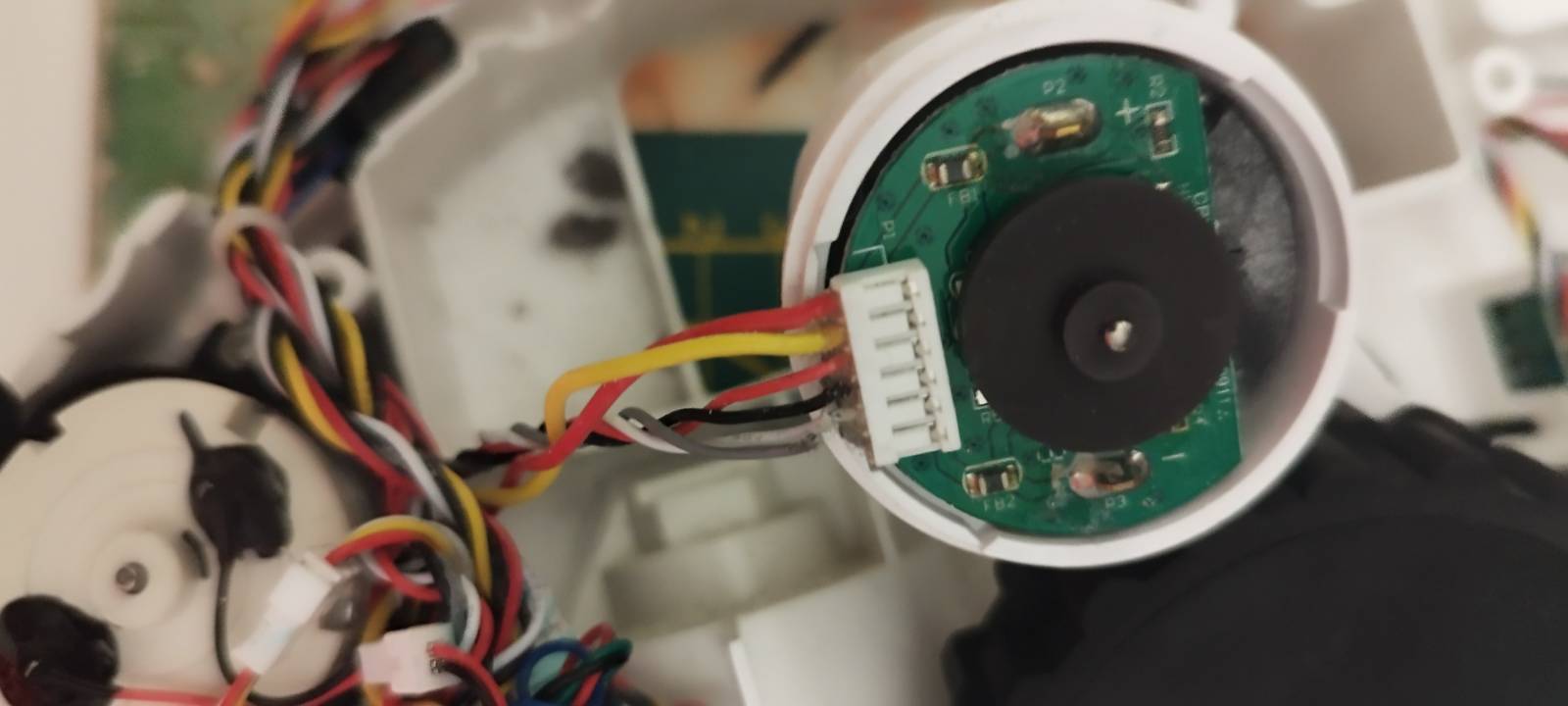 Tentokrát byl již po záruce a právě proto jsme ho se synem rozebrali. Právě syn nalezl závadu. Motory pohonu mají zezadu na ose zřejmě vícepólový magnetický kotouček a snímač na desce pro vypočítání ujeté vzdálenosti. Na pravém motoru je, ale vývod umístěn tak, že při pohybu ramena s kolem dochází k nařezávání vodičů od snímače o ostrou hranu výlisku spodní části těla robota / vysavače (viz. foto). Vysavač má sice spoustu různých čidel včetně lidaru na kterém jasně vidí a zobrazuje překážku, ale programově je vybavený tak, že pokud nemá signál z kola, tak se prostě zblázní bez jakéhokoliv chybového hlášení a naprostou ignorací ostatních čidel jako například infrazávor v nárazníku nebo lidaru.