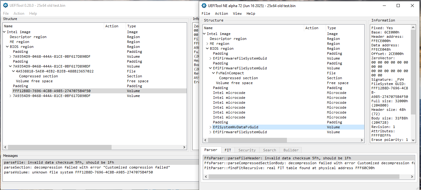 Teraz som si všimol že to dolu píše invalid data checksum, a keď na to spravím dvojklik, nasmeruje ma to na EfiFirmwareFileSystemGuid -> FvMainCompact, a položka na ktorú smeruje Customized compression failed je hneď pod tým. Možno bude stačiť opraviť túto položku a starý dump sa rozbehne. To bude najľahšie.