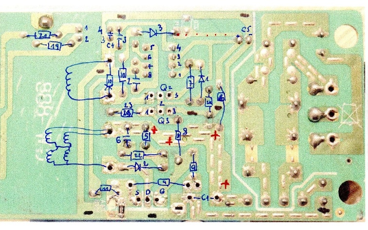 Mohla by být proražená dioda na sekundáru. Mohl by být nějaký mezizávitový zkrat na trafu. A nebo bude něco špatného v ochraně D2 C6 R22 R5.
