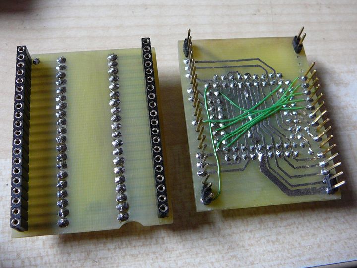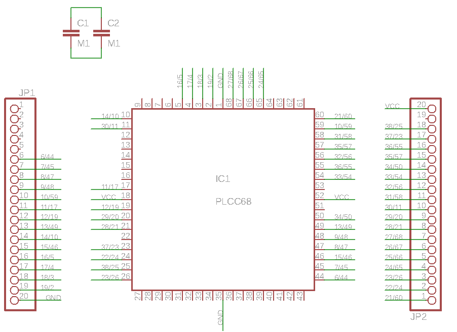 Sice to není přímo vlákno o konverzních modulech pro Elnec, ale byla tu o nich řeč. Objevila jsem v adresáři Elnecu soubor adapters.txt s popisem podporovaných adaptérů jiných firem a mezi nimi je zmíněný adaptér AS-68-40-03PG-6 od fy. Emulation Technology pro CPLD EP1800 od Altery (od Elnecu stojí 6000Kč). Na internetu se dá najít PDFko se zapojením toho adaptéru. Je sice pro pouzdro PGA, ale podle datašítu není problém si to přečíslovat pro PLCC. Tak jsem si po dlouhé době zase trochu kreslila a leptala plošňáčky a adaptér pro EP1800 v PLCC68 jsem si vyrobila. Kupodovu i funguje. Někomu by se ten adaptér také mohl hodit, tak přikládám i zapojení patice.