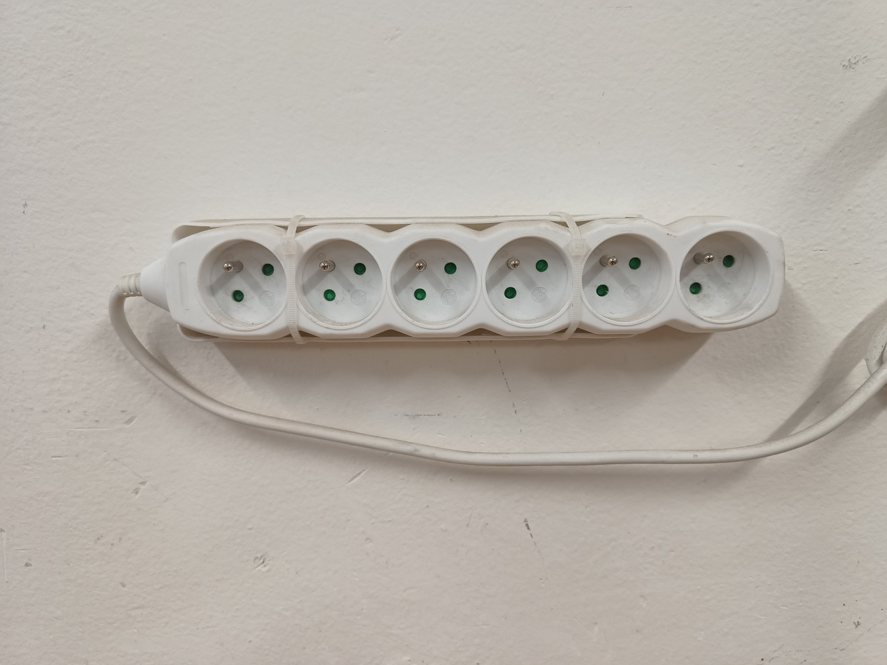 Na zdi přišroubovaný originální pružný držák za cca 30 Kč. Vícezásuvka zajištěná dvěma vázacími pásky. Funguje mi to dlouhodobě na řadě míst doma i v práci.