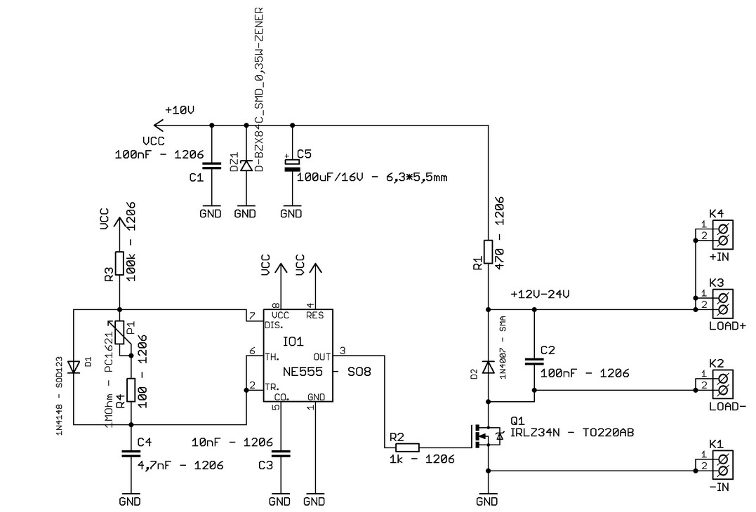 Našel jsem na internetu velmi šikovný PWR regulátor s jedním obvodem NE555 a spínacím FET tranzistorem. Zdroj sice nemá stabilizaci napětí ani proudu, ale to autíčkům nebude vadit.