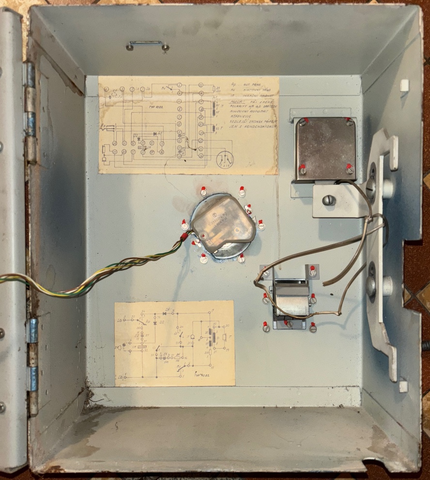 Vnitřek telefonního automatu, mincová dráha z pravého horního rohu středem nad kasičku, chybí korýtko (vlevo přes vidlici) pro vracení minci do dvířek