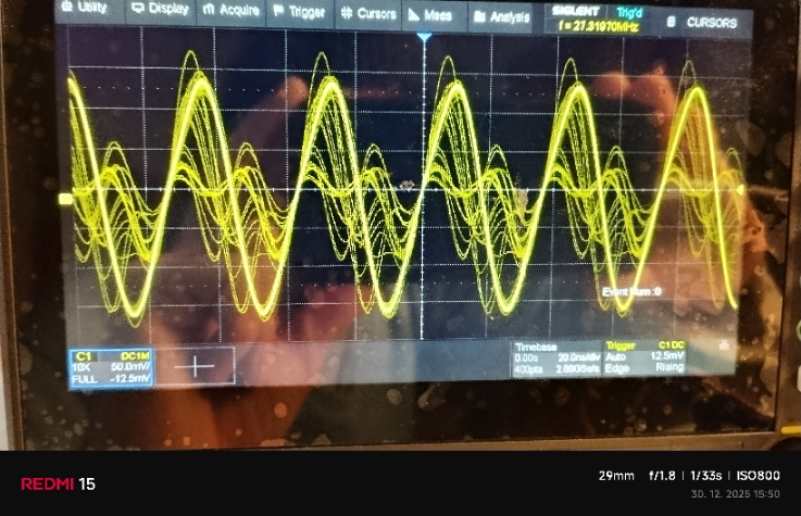 Keďže ešte nemám rozostavanú WS11 tak som kryštal pre TX z Futaby dal do vysielača WP 23, išlo mi čo to bude fungovať. Na puzdre kryštálu je 40,935 MHz. Ako mi Celeron poradil urobil som cievku ako sondu pre osciloskop, na priloženej foto je vidieť čo osciloskop nameral 40,96181 MHz. Inak ta sinusoida na tých 40MHz je krajšia ako na 27MHz