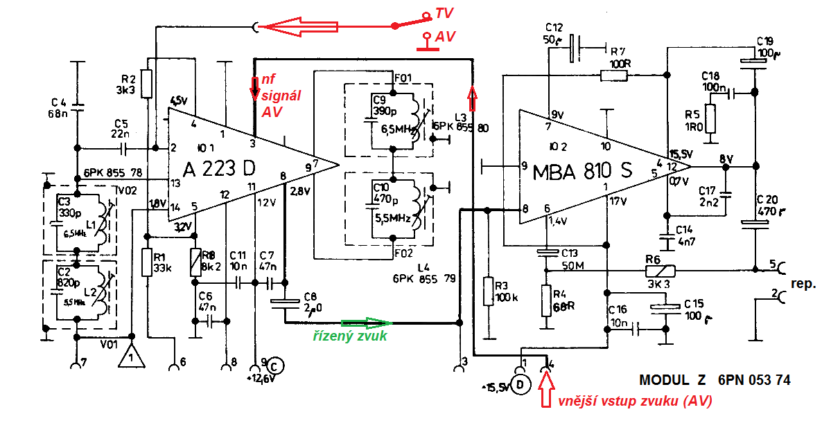 Pak na pin 4 zásuvky Z jen přes kondík asi 2 µF přivedeš vnější nf signál. Pin 8 zásuvky modulu Z zůstane nezapojený (tam je výstup zvuku ještě před řízením hlasitosti).