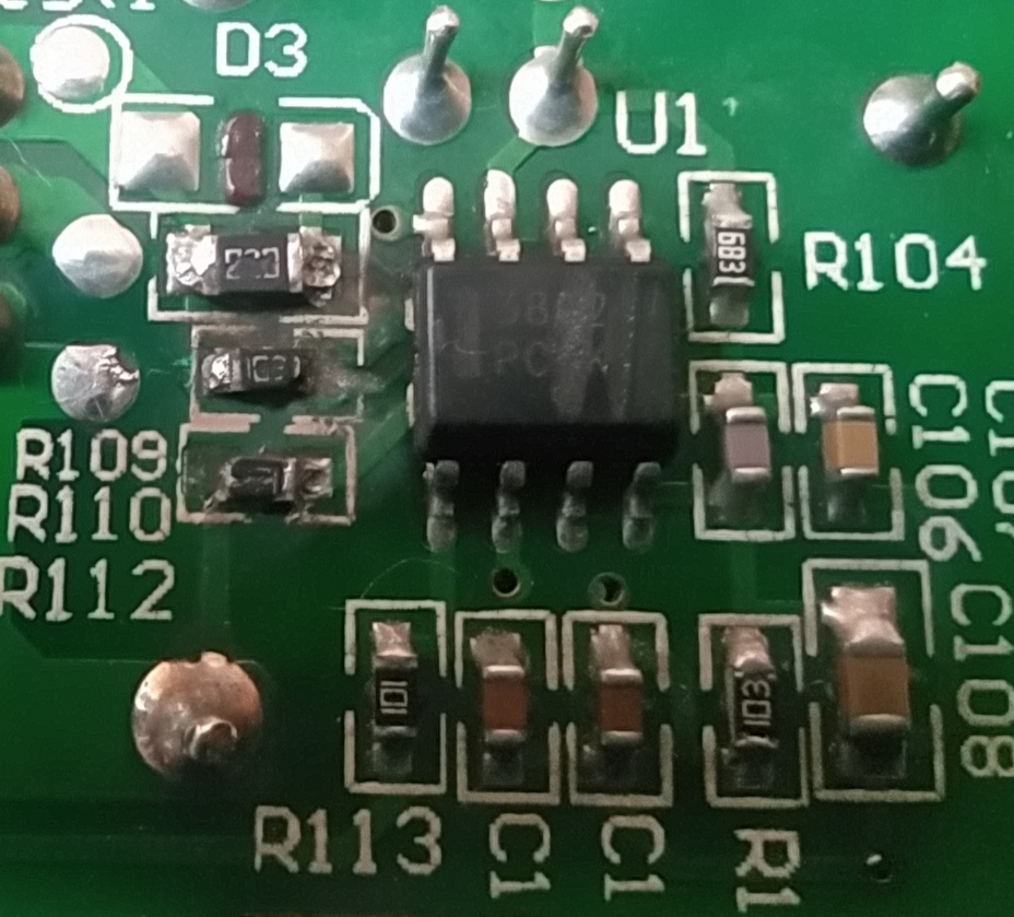 Z druhej strany dosky je svab 3842B a pri nom nejako pofiderne vyzerajuce R110, R112 ,ktorych hodnoty sa daju namerat 100k a 160k.