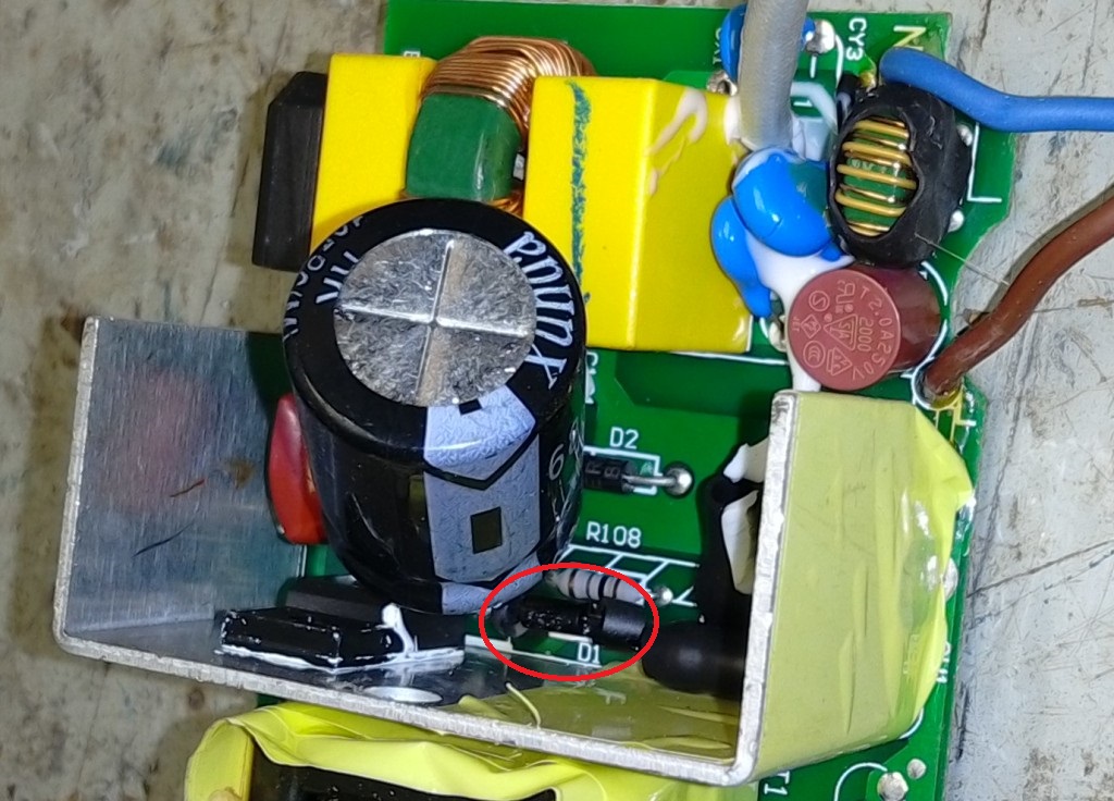 Po rozobrati som zistil spalenu diodu D1 na primarnej strane.