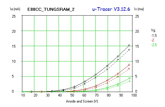 ECC88 a podobné mohu změřit a vypadnou z toho krásné obrázky, měřím oba systémy najednou, super pro párování. Používám Utracer3+. S kmitáním jsem problém u ECC88 a E88CC neměl, pár kusů jsem jich vybíral do diferenčního zesilovače. Mohu změřit, ale jsem trošku z ruky Ivančice. Pokud si vzpomínám tak Tesly co jsem měřil, tak měly docela stejné systémy. Koupil jsem Tungsram, ale ty už tak shodné nebyly. Viz obrázek a to je lepší shoda charakteristik. Proud Ia je proud prvního systému, Is je proud druhého systému.