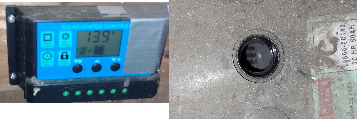 Dále jsem si poslechl aku u dieselu - žádný šum. Pro jistotu jsem ještě zkontroloval baterku, co mi napájí ohradník a je dobíjena FV panelem. Tam mám sice nastaveno napětí na 14V, protože se trvale vybíjí, ale princip je stejný. A ani bublina. Foto přikládám.