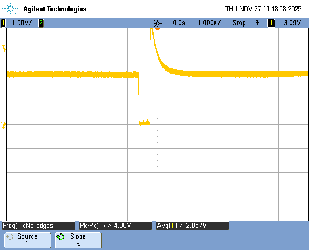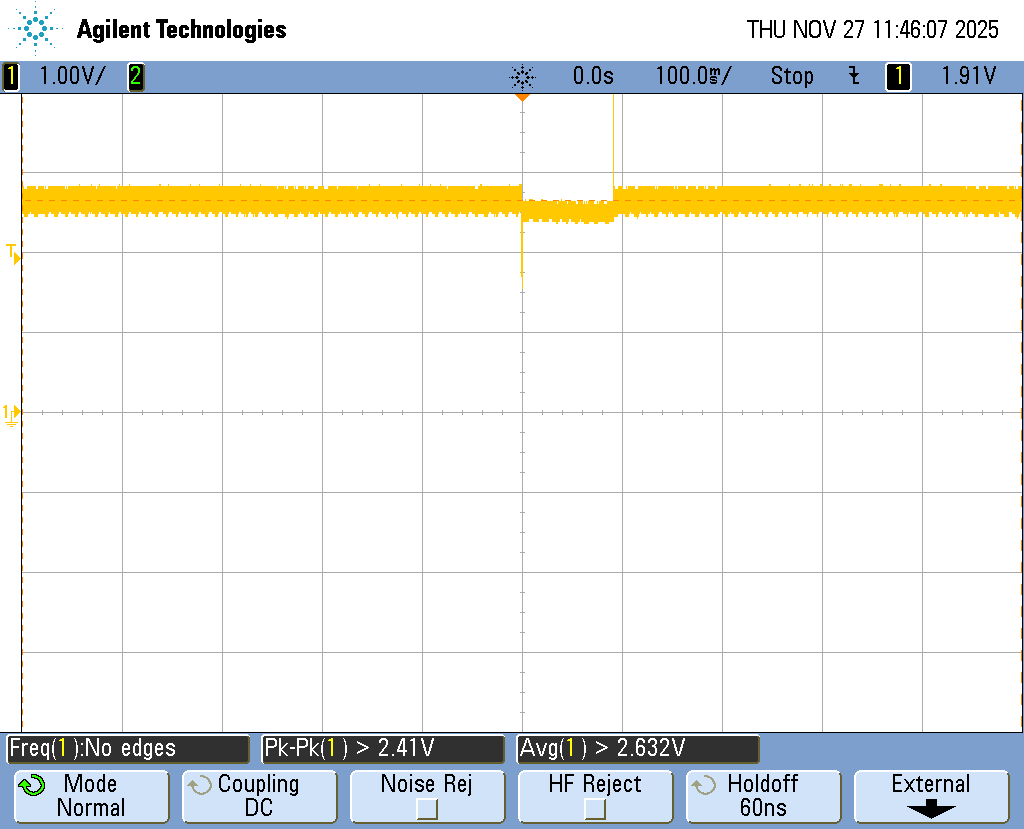 Jak jsem psal vyse, LED zarovky od EMOSu maji tendenci pomerne brzo a nahle zdechnout. Nicmene zhruba v polovine pripadu pred tim par hodin poblikavaji. Uz v lete jsem to chtel zaznamenat, ale zarovka zdechla nez jsem stihnul nastavit osciloskop. Smile