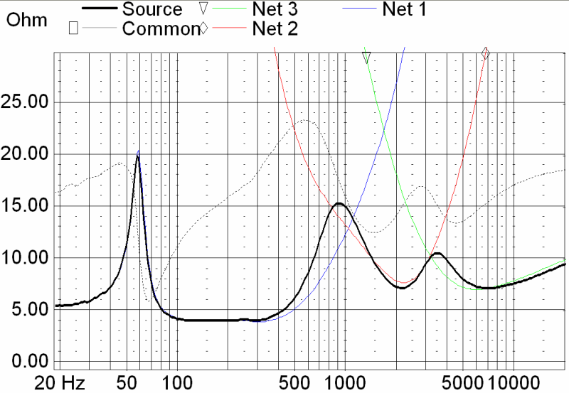 Sám píšeš o frekvenční závislosti impedance. Tady máš na obrázku naprosto typickou impedanční křivku reálné trojpásmové soustavy. Nebudeš doufám tvrdit, že bude při konstantním napětí na 60Hz nebo na 1kHz bude odebírat stejný proud jako na 200Hz. Na těch konkrétních frekvencích si tepelná pojistka nějakého proudového přetížení vůbec nevšimne.