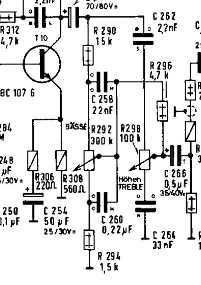 To co popisuju je ve schematu popsáno (viz přiložený obrázek na začátku) BASSE a TREBLE. Potenciometr BASSE je 300k/G, pot pro výšky má 40k a je lineární, evidentně má být 100k/G. V tomto zapojení musí teď být hodně vlevo aby byla charakteristika vyrovnaná.