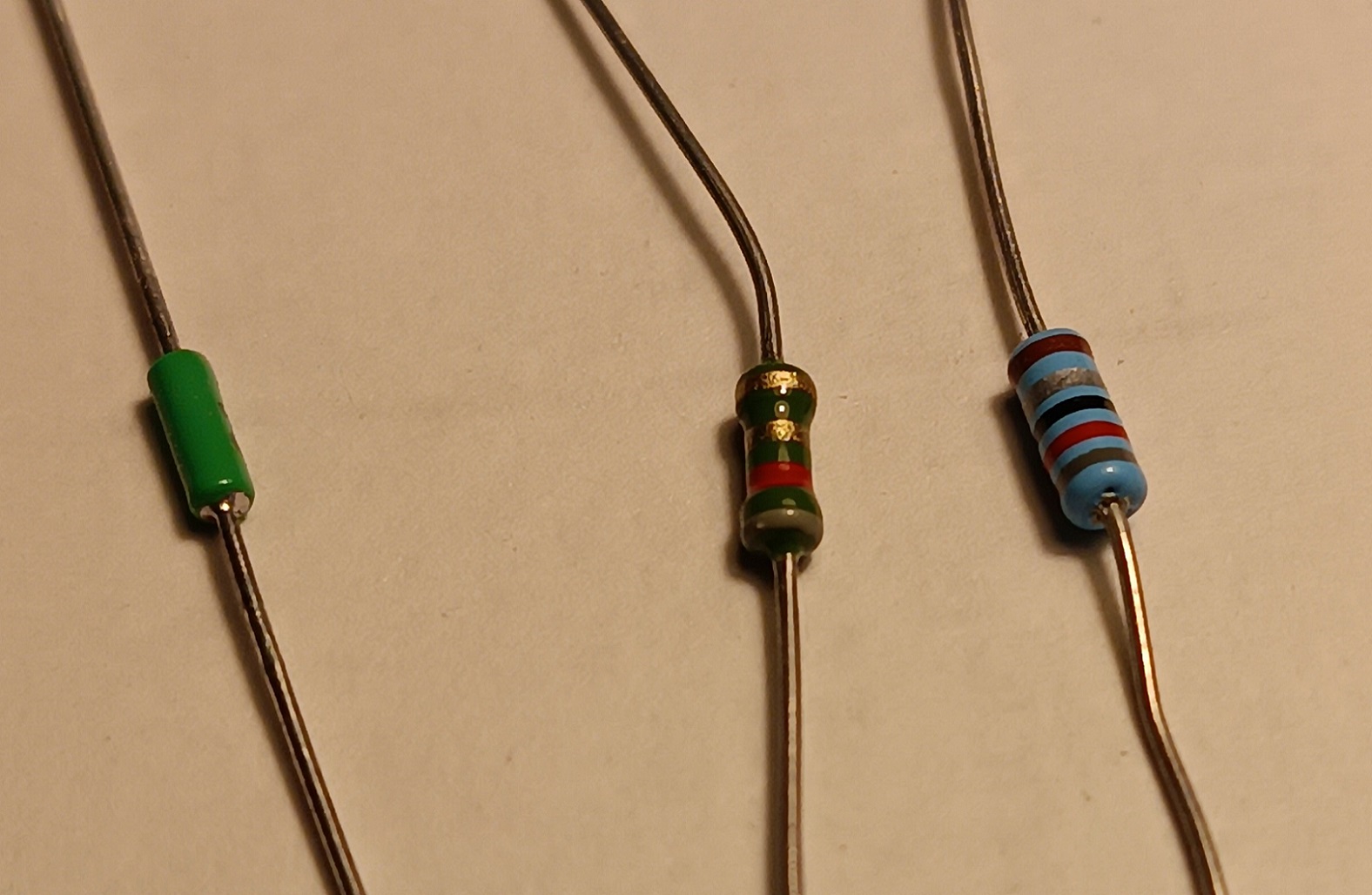 Slíbený fotky. Vlevo je zelenej TR191, o těch není řeč. Uprostřed je klasická čepičková 0,6W metalíza a vpravo je ten rozpadající se šajz. Jak vidno trochu bachratější a nemá čepičky.