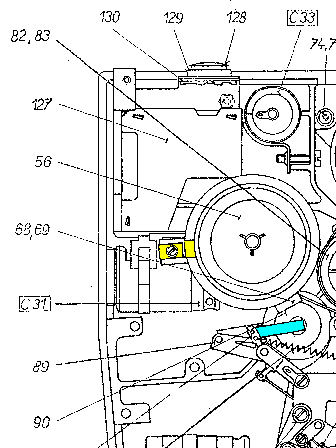 - odjisti (žlutou) zajišťovací planžetu a vyndej levý unášeč 56 (případně i podtalíř)