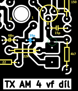 Bohužel musím na sebe prozradit, že jsem úplný trotl, nevím jak to jinak nazvat. Prostě při "nedůsledné" kontrole po pájení jsem posoudil tu spojnici plošky pro krystal jako slitou s vedlejší cestou a se skalpelem jsem jí pěkně "pročistil" (viz. obrázek ). Následně jsem tento bod již přehlížel, protože jsem to přece udělal já!! tak to nemůže být špatně. Chybu jsem mylně hledal všude jinde - ve vinutí cívky, vadném tranzistoru , vadném kondenzátoru atd. a nebýt toho, že si mě navedl až k té bázi T1, tak bych to hledal ještě asi dlouho.