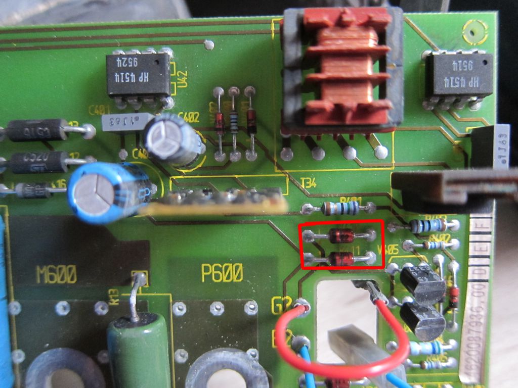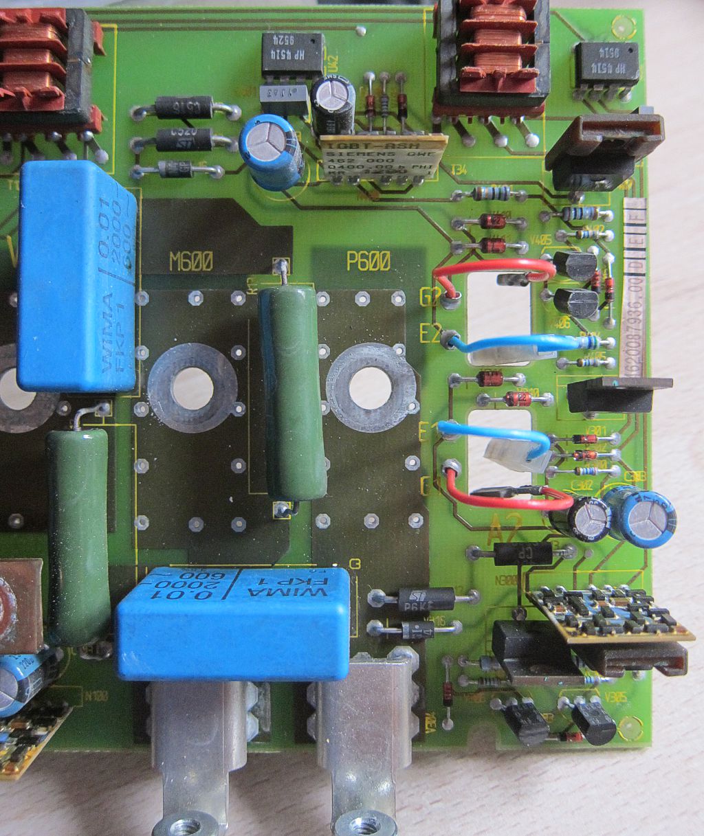 Takhle vypadají ty budící obvody. Jestli na těch něco odešlo, tak jsem bez šance to opravit. Co jsem zatím měřil, tak jsou vyzkratované ty dvě ochranné diody u gate. Zdá se, že signál jde patrně přes ty optrony HP4514, nebo co to vlastně je, pak na ty budící obvody, z nich na komplementární pár výkonových tranzistorů D44/45H11 a přes tranzistory V405 + další, na ty ochranné diody u gate tranzistorů. Předpokládám, že hlavní buzení gate, obstarávají ty výkonné tranzistory D44/45H11a ty V405 zajišťují rychlé uzavření IGBT tranzistorů. Napájení pak zajišťují ty transformátorky.