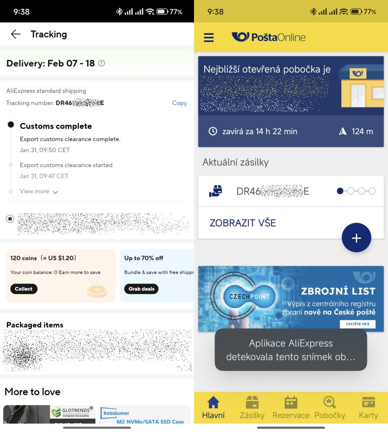 Taky jsi tvou zásilku sledovala, jinak bys o ní nevěděla a tohle tomu jen pomáhá. Níže je, jak ta zásilka vypadá v AE a ČP. Samozřejmě se tam nakonec objeví dvouhodinové okno, kdy ji bude ČP doručovat.
