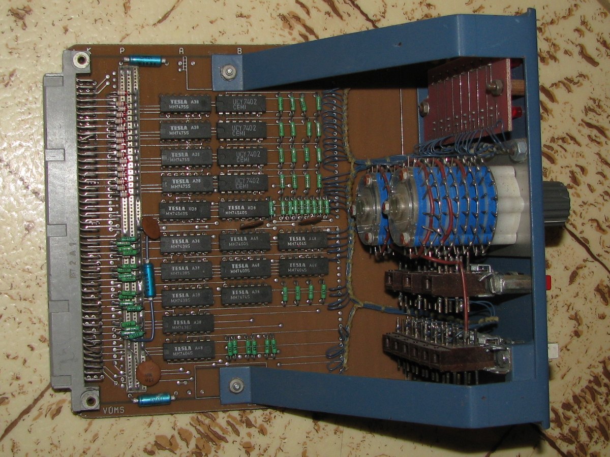 Jeden kus má z dřívějška slíbený matus15. Tento exemplář navíc obsahuje desku s 7400, 7402, 7404, 7438, 7440, 7474, 7575, se zelenými R a s diodami KAxxx (červená katoda a dále červená, oranžová, oranžová, z internetových tabulek jsem nevyčetl nic). Já bych to jinak rozebral na součástky, i ty tenké modré drátky se hodí (naposledy při opravě Didaktiku).
